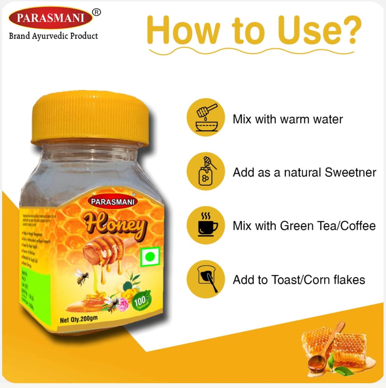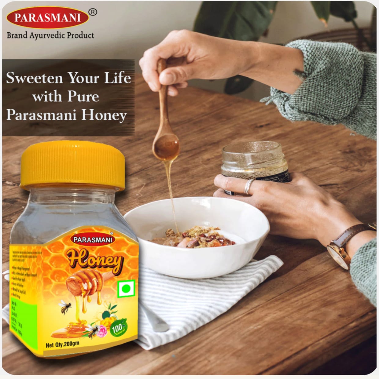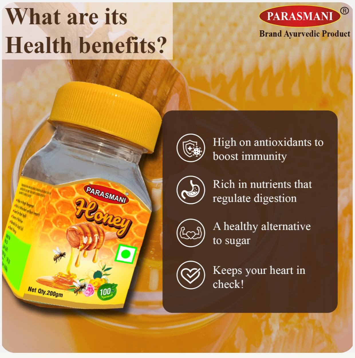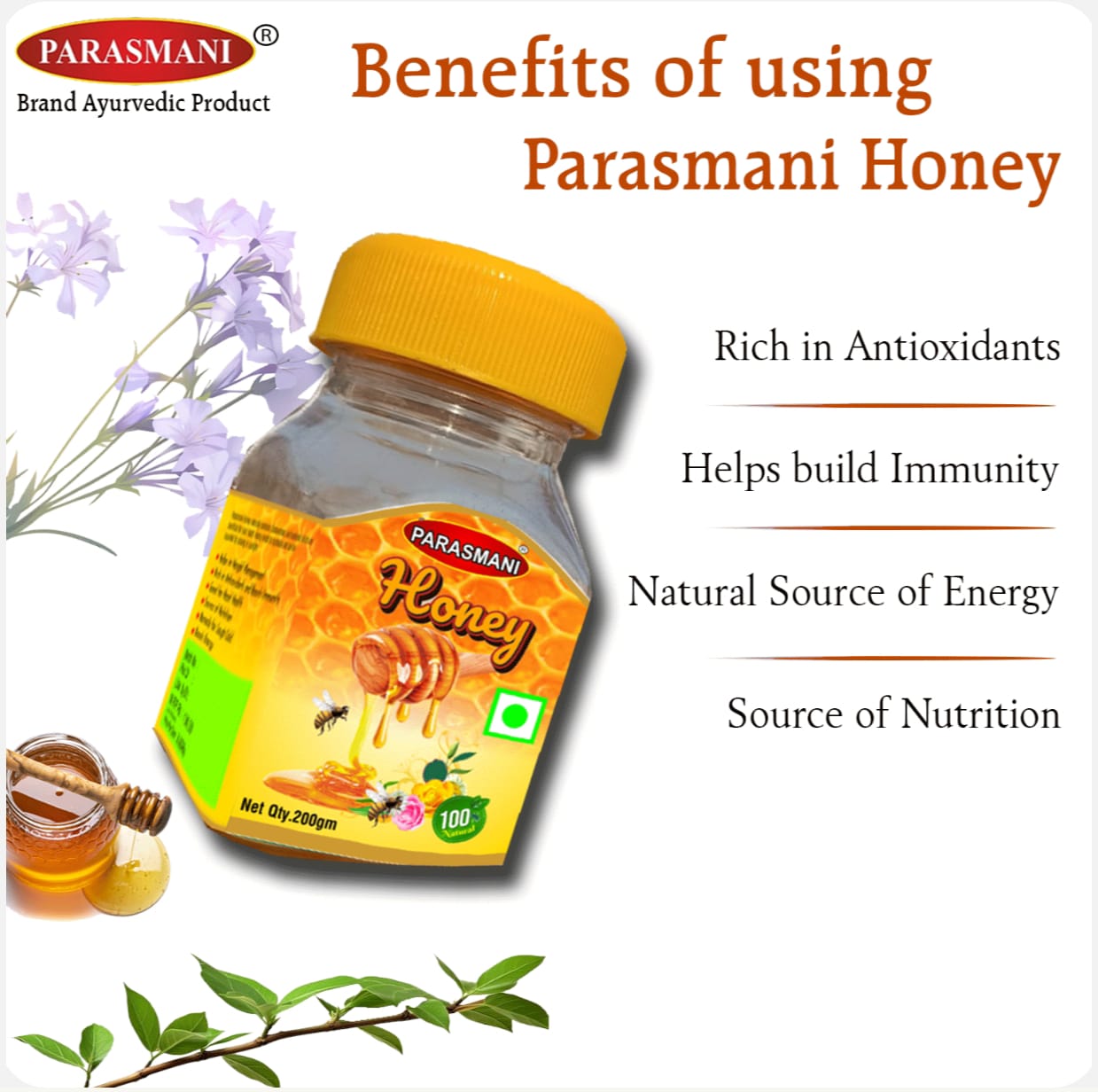 Nature’s sweetest healer. Parasmani pure and natural honey is rich in antioxidants and nutrients that boost immunity, improve digestion, and energize the body. It also nourishes the skin, adds good health, and soothes the throat. Enjoy it daily for natural sweetness, good health, and radiant beauty-straight from nature.